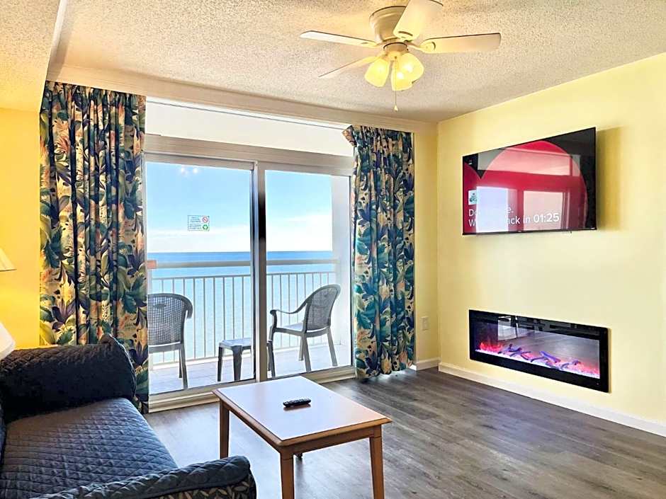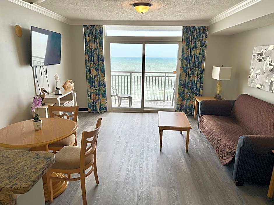 This villa has two queen beds in a private bedroom, 1 double Murphy bed, and 1 sofa bed in a separate living room area.